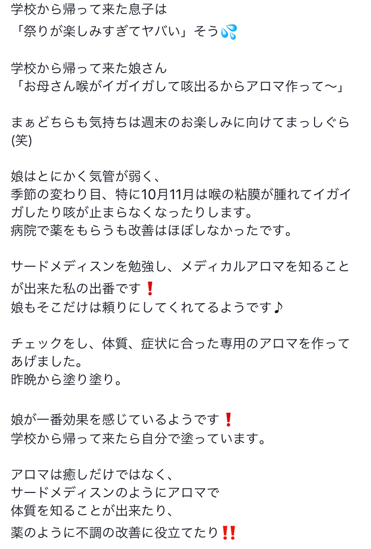 B3C45120-AF6D-4623-890F-23939B752C16 Tweet Share camille 海歩(Miho):嗅覚反応分析士トレーナー。AEAJアロマインストラクター。主婦の立場から、薬効を持つアロマで家族の健康サポートを期待し、40歳で学び始める... プロフィール Tweet Share ピックアップ記事 aroma_check 身体と繋がるアロマ aroma_check SCHOOL 2025スケジュール SCHOOL SCHOOL スクール#02【自分を知る】嗅覚反応分析士基礎講座 SCHOOL 関連記事一覧 SCHOOL 2025スケジュール aroma_check 身体と繋がるアロマ SCHOOL スクール#02【自分を知る】嗅覚反応分析士基礎講座 SCHOOL アロマを学ぶなら嗅覚反応分析士入門講座がおススメな理由 event 加西市ねっぴ〜Pay加盟店です aroma_check 【ご感想】可視化されると何事もポジティブになる みんなの活用術 婚活♡サードメディスン event 【香りと菓子の日】あたらしいくらしのアロマレッスン