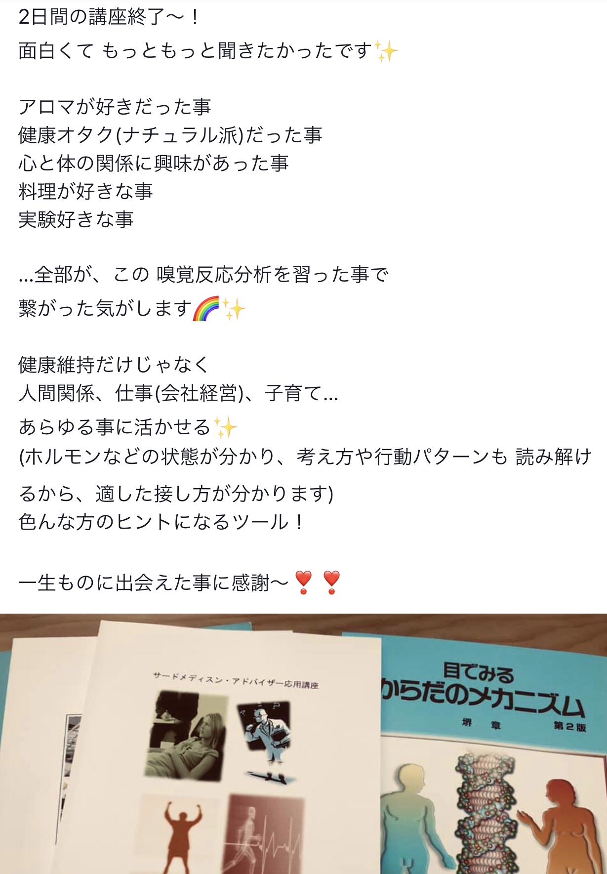 9A2A2BD3-4754-4A4C-A157-310D71BBAEDF Tweet Share camille 海歩(Miho):嗅覚反応分析士トレーナー。AEAJアロマインストラクター。主婦の立場から、薬効を持つアロマで家族の健康サポートを期待し、40歳で学び始める... プロフィール Tweet Share ピックアップ記事 aroma_check 身体と繋がるアロマ aroma_check SCHOOL 2025スケジュール SCHOOL SCHOOL スクール#02【自分を知る】嗅覚反応分析士基礎講座 SCHOOL 関連記事一覧 SCHOOL 2025スケジュール aroma_check 身体と繋がるアロマ SCHOOL スクール#02【自分を知る】嗅覚反応分析士基礎講座 SCHOOL アロマを学ぶなら嗅覚反応分析士入門講座がおススメな理由 LOG イベントに出続ける理由 みんなの活用術 IMチェック結果が書き込める付箋が楽しすぎる LOG 1月とノート LOG 私が嗅覚反応分析士入門講座を受講したきっかけ