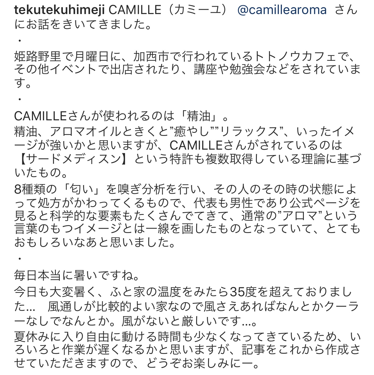 B722BB84-2665-40D7-99D7-8F8241B9B873 Tweet Share camille 海歩(Miho):嗅覚反応分析士トレーナー。AEAJアロマインストラクター。主婦の立場から、薬効を持つアロマで家族の健康サポートを期待し、40歳で学び始める... プロフィール Tweet Share ピックアップ記事 aroma_check 身体と繋がるアロマ aroma_check SCHOOL 2025スケジュール SCHOOL SCHOOL スクール#02【自分を知る】嗅覚反応分析士基礎講座 SCHOOL 関連記事一覧 SCHOOL 2025スケジュール aroma_check 身体と繋がるアロマ SCHOOL スクール#02【自分を知る】嗅覚反応分析士基礎講座 SCHOOL アロマを学ぶなら嗅覚反応分析士入門講座がおススメな理由 LOG 出会えてるという奇跡 LOG アロマテーブル7月8日(水)募集中です event テーブルで得られるもの event 悩みやすい性格を整える